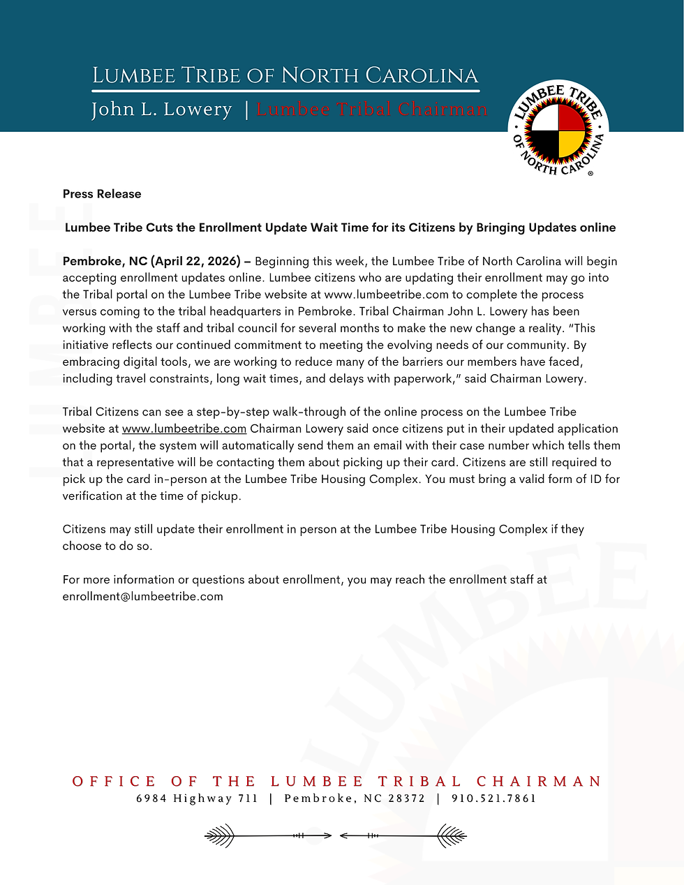 Pembroke, NC (April 22, 2026) – Beginning this week, the Lumbee Tribe of North Carolina will begin accepting enrollment updates online. Lumbee citizens who are updating their enrollment may go into the Tribal portal on the Lumbee Tribe website at www.lumbeetribe.com to complete the process versus coming to the tribal headquarters in Pembroke. Tribal Chairman John L. Lowery has been working with the staff and tribal council for several months to make the new change a reality. “This initiative reflects our continued commitment to meeting the evolving needs of our community. By embracing digital tools, we are working to reduce many of the barriers our members have faced, including travel constraints, long wait times, and delays with paperwork,” said Chairman Lowery.
